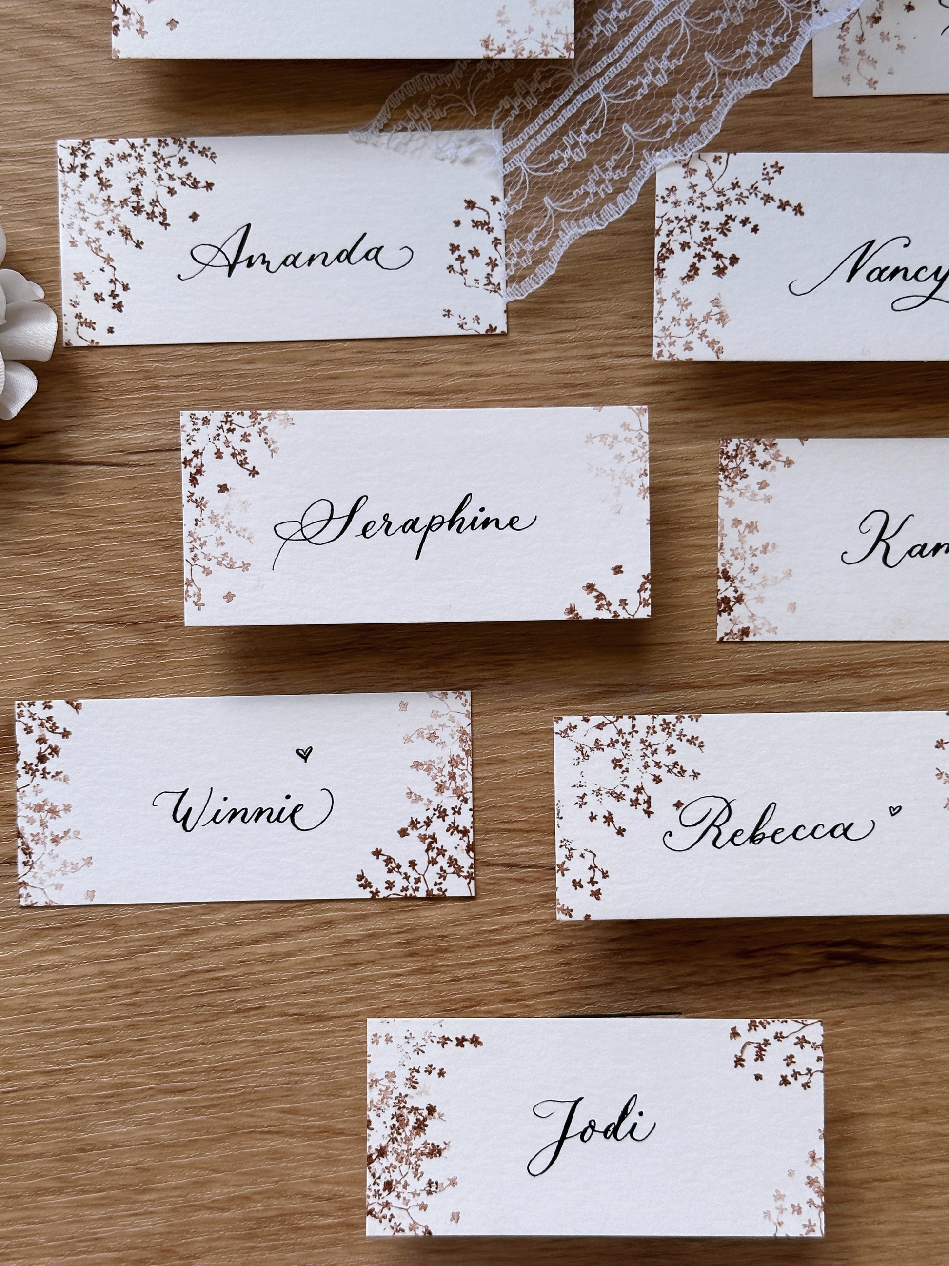 Add an elegant and personal touch to your wedding with our custom calligraphy place cards. Each card is beautifully hand-lettered by the Founder, Eunice to guide your guests to their seats in style, creating a memorable and sophisticated table setting.