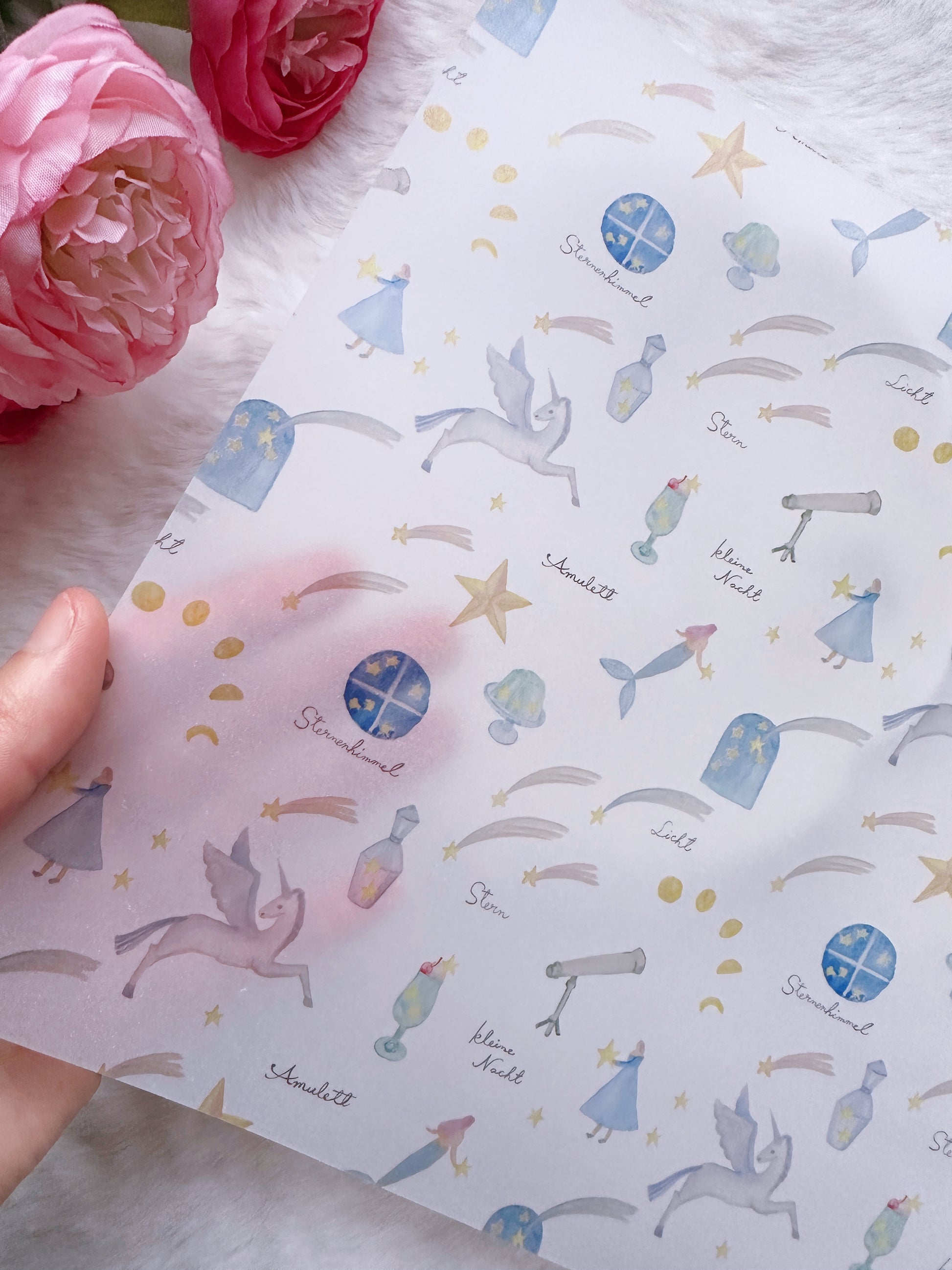 A magical night sky comes to life in this whimsical A4 size vellum paper by Kin.iro.hitode. Featuring unicorns, shooting stars, mermaids, telescopes, and more. Each element is sprinkled with wonder and childlike curiosity.