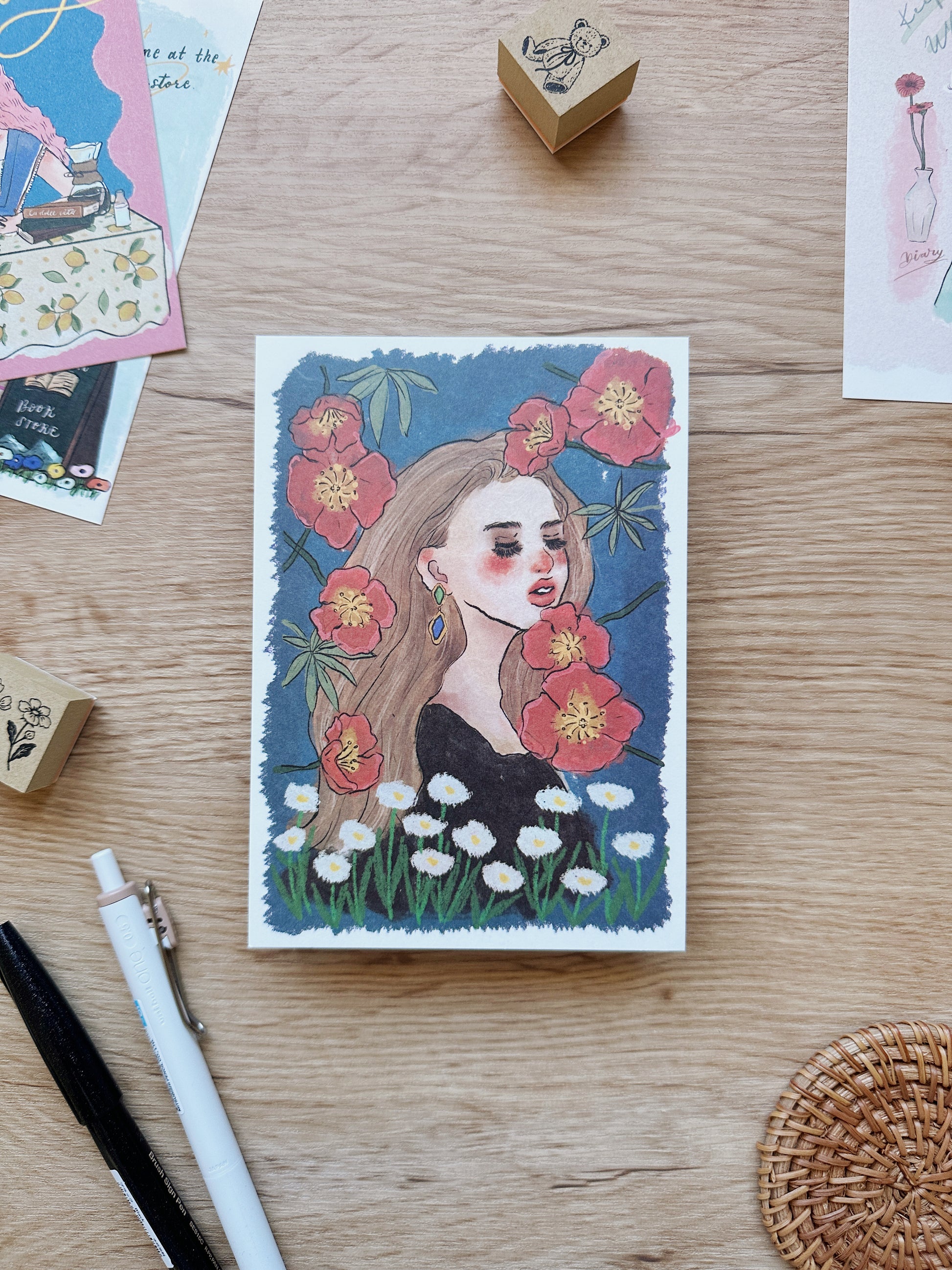 A timeless and elegant postcard with a rich, vintage charm. The deep hues and graceful floral accents evoke warmth and quiet confidence. A gentle reminder that you are the blooming season—ever-growing, radiant, and full of life. Perfect for heartfelt messages, journaling, or keeping as a cherished keepsake.