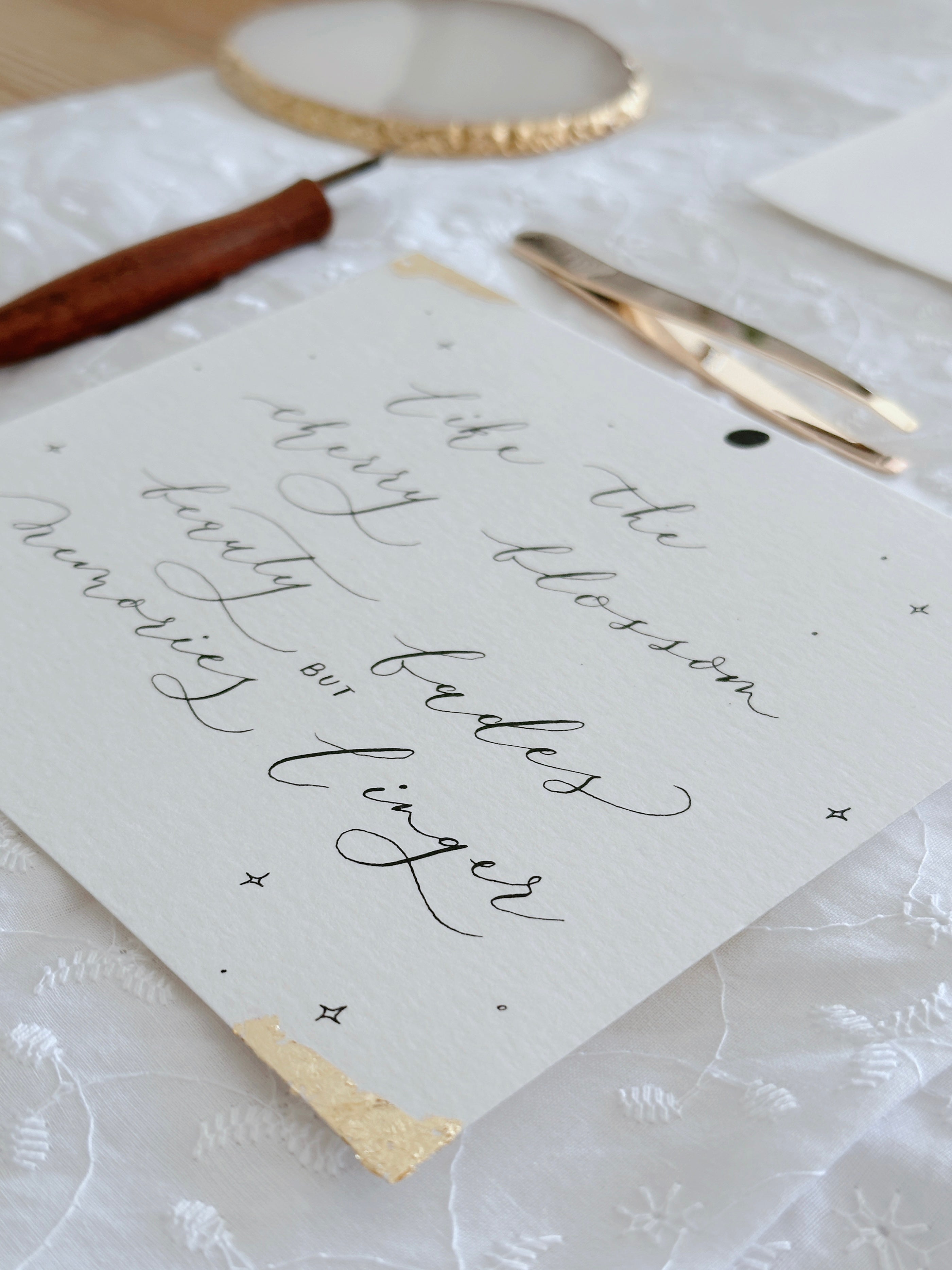 We also provide custom calligraphy services, perfect for adding a personal and artistic flair to cards, wedding stationery, personalized gifts and other bespoke creations. Let us bring your ideas to life with beautifully crafted, one-of-a-kind pieces.