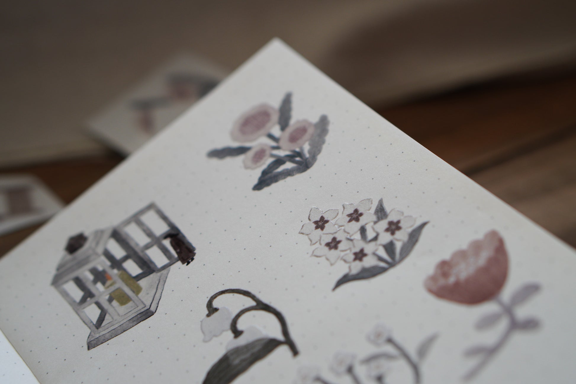 Bring a touch of serenity to your projects with The Afternoon's Garden Transfer Sticker set, a beautiful set inspired by the simple pleasures of a garden afternoon. This set comes in a set of 2, one in a matte finish, perfect for use on paper surfaces like journals and notebooks, and one in a glossy finish (waterproof) ideal for decorating glass, cups, and other smooth surfaces.