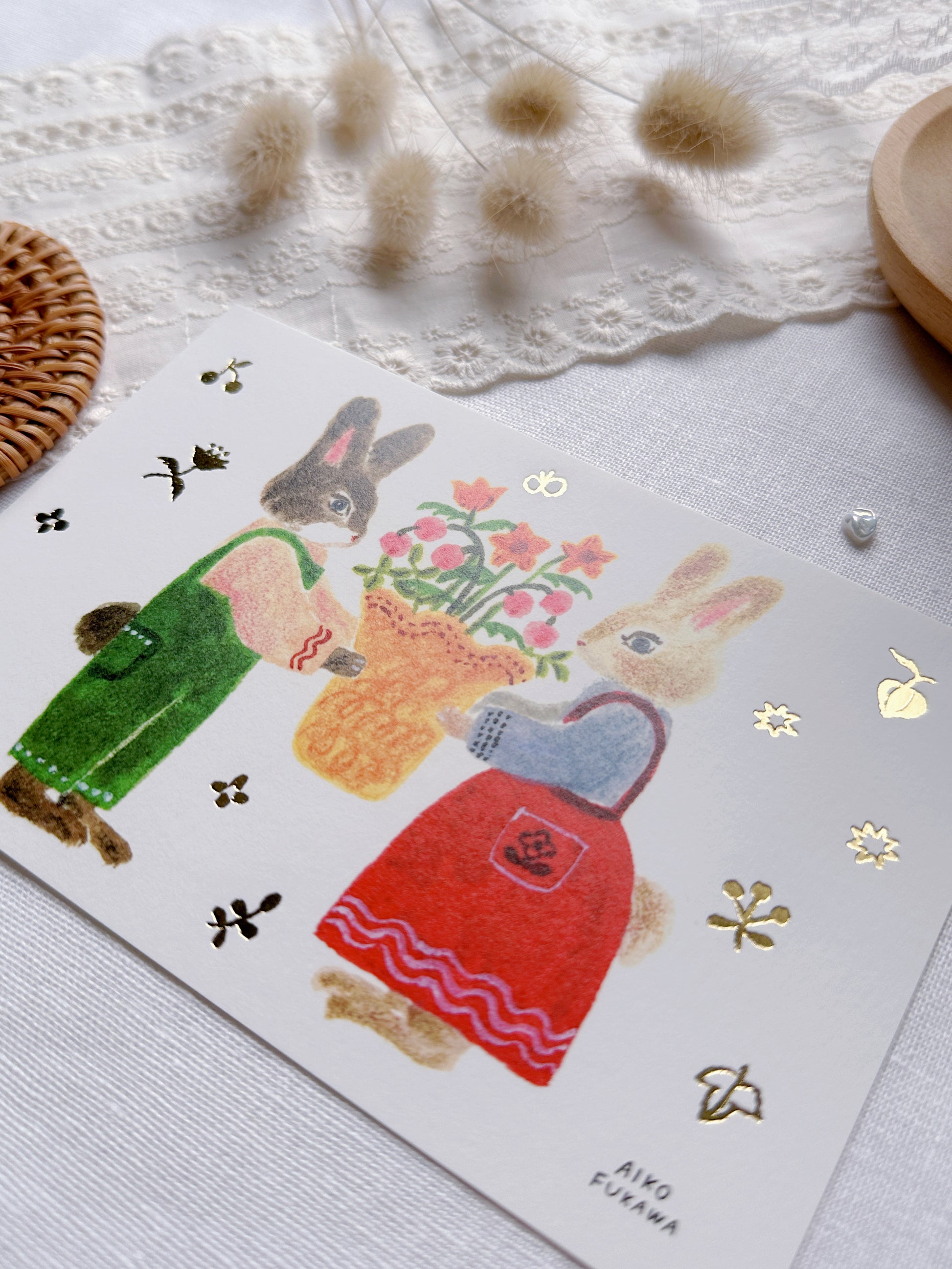 Immerse yourself in the enchanting world of Aiko Fukawa with this beautifully designed foil-stamped postcard. Featuring a delightful scene of rabbits presenting a vase brimming with charming flowers, this artwork exudes a sense of festivity and elegance. The gold foil details add a radiant and refined touch to the design, making it a true standout.