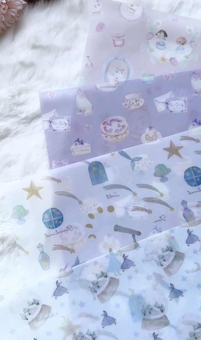 Soft as a dream and delicately illustrated, this Lavender Tea Room A4 size vellum paper by Kin.iro.hitode features a gentle lavender backdrop adorned with whimsical motifs - teacups, cakes, letters, florals, and charming cats. Each design feels like a page out of a cozy fairytale, perfect for adding a soft, elegant touch to your creative projects.