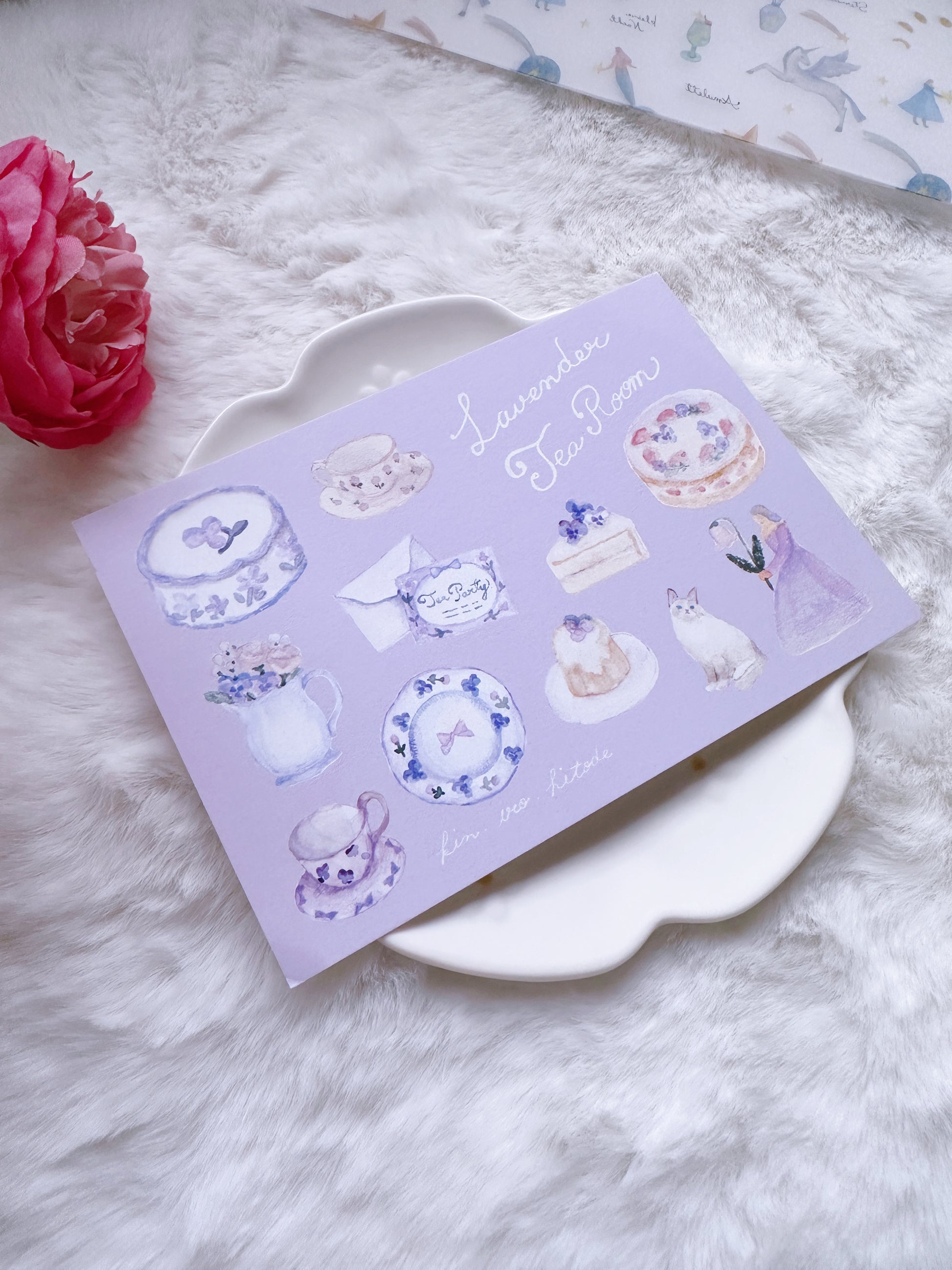 A delicate escape into a world of tea, florals, and quiet charm, the Lavender Tea Room postcard by Kin.iro.hitode features soft watercolor illustrations of cakes, teacups, fine china, florals, and furry companions, all set against a calming lavender background. Printed on both sides, this postcard is a lovely piece to send, collect, or display.