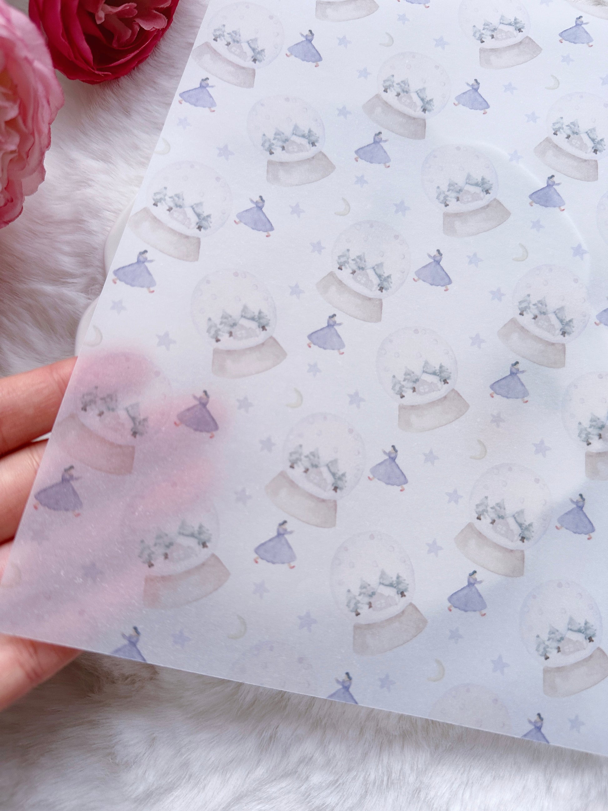 Step into a quiet winter’s night with Snowy Waltz, a whimsical A4 vellum paper by Kin.iro.hitode. Featuring delicate snow globes, moonlit skies, and a graceful girl mid-spin, this design captures the soft magic of snowy evenings and fairytale dreams.