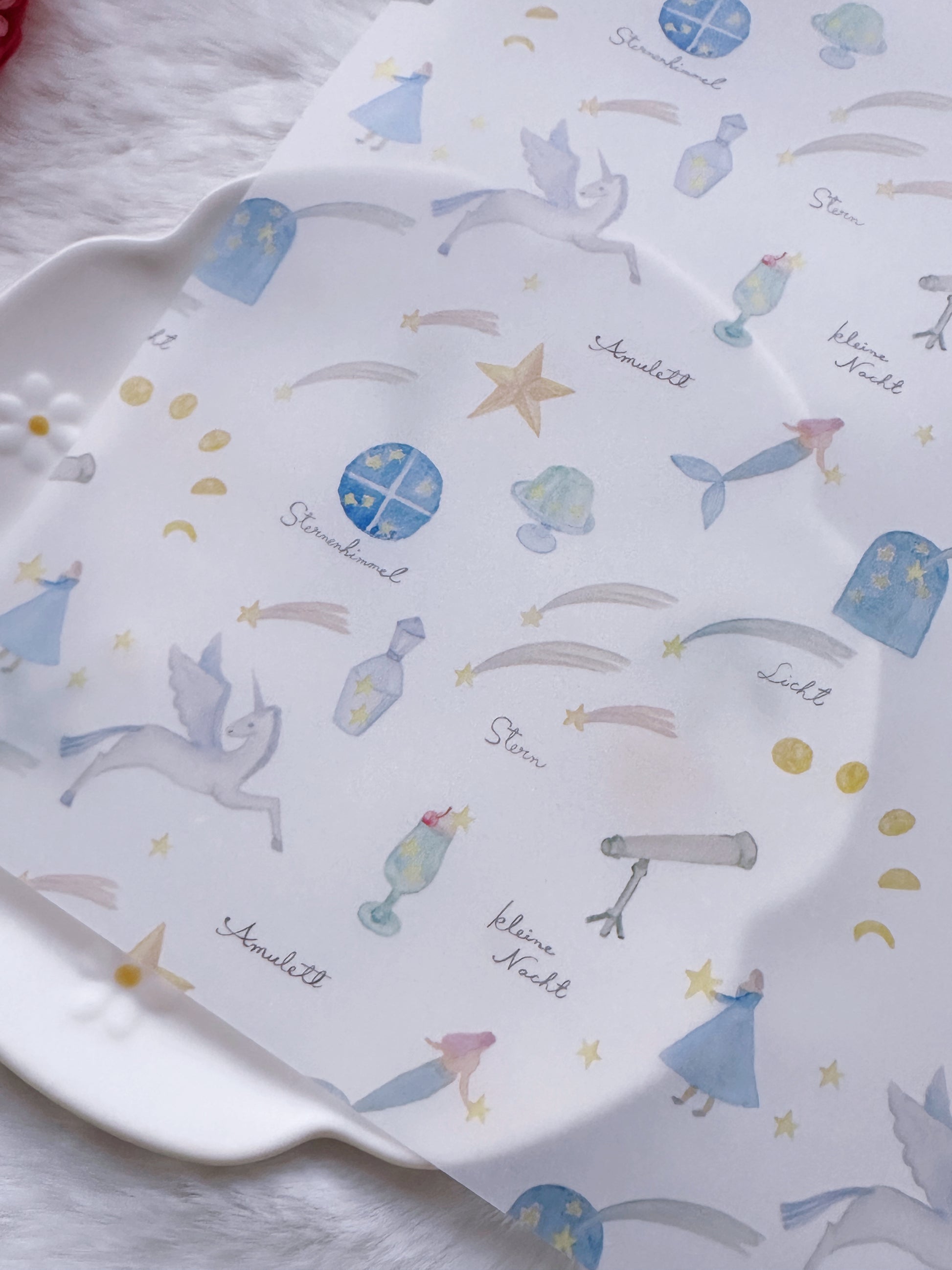 A magical night sky comes to life in this whimsical A4 size vellum paper by Kin.iro.hitode. Featuring unicorns, shooting stars, mermaids, telescopes, and more. Each element is sprinkled with wonder and childlike curiosity.
