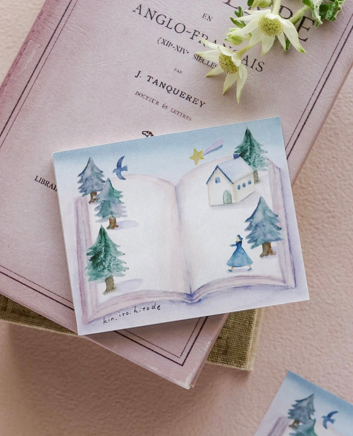 Unfold a quiet tale with Tales from the Book by Kin Iro Hitode, a beautifully illustrated memo pad that captures the essence of a dreamy winter storybook. Each sheet features an open book design, revealing a tranquil scene of snow-dusted pine trees, a cozy house, and a lady in a flowing blue dress. Rendered in soft watercolor and pastel tones, this memo pad evokes a sense of wonder and stillness, perfect for those who love to write, reflect, or collect beautiful paper.