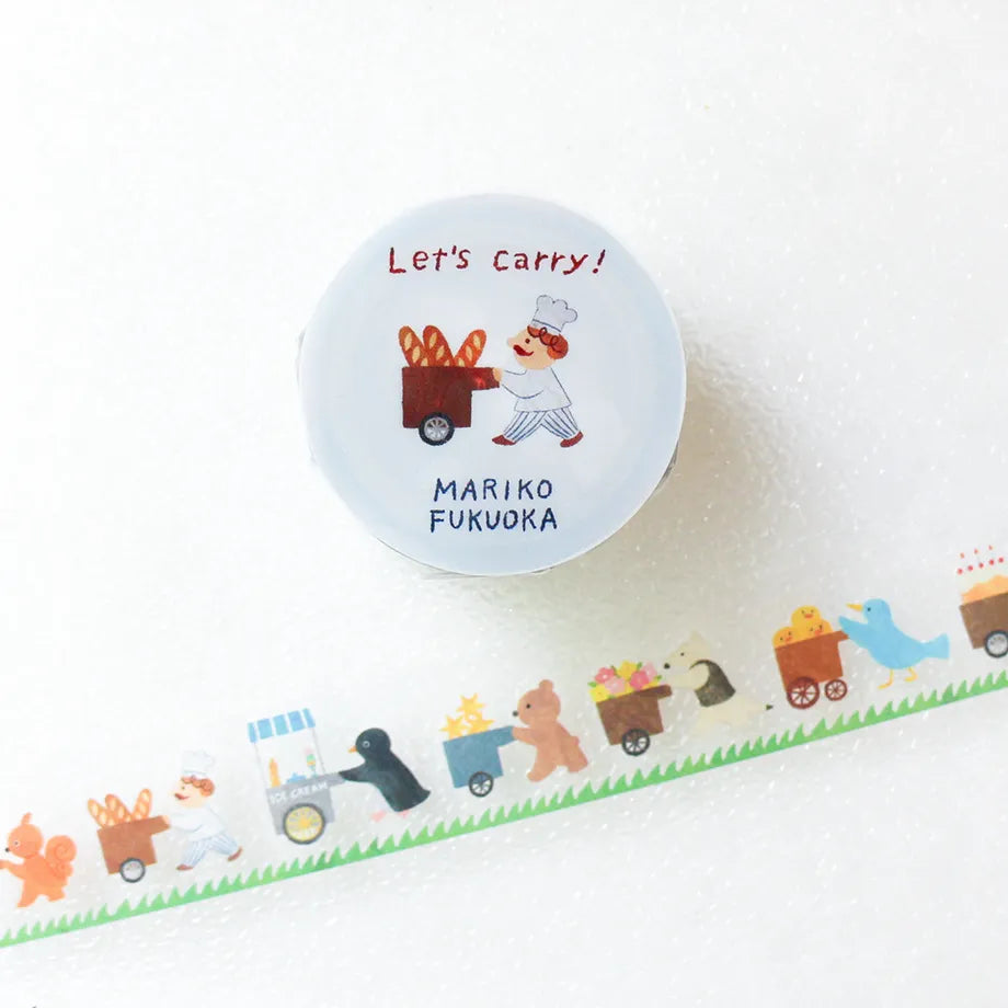 Add a touch of whimsy to your crafts with Mariko Fukuoka's transparent washi tape Let's carry! Featuring charming illustrations of various characters carrying different items, this tape brings a playful and cute element to any project. From a cook carrying freshly baked bread to a bird with a chick and an elephant with a large cake, the delightful scenes are sure to bring a smile to your face.