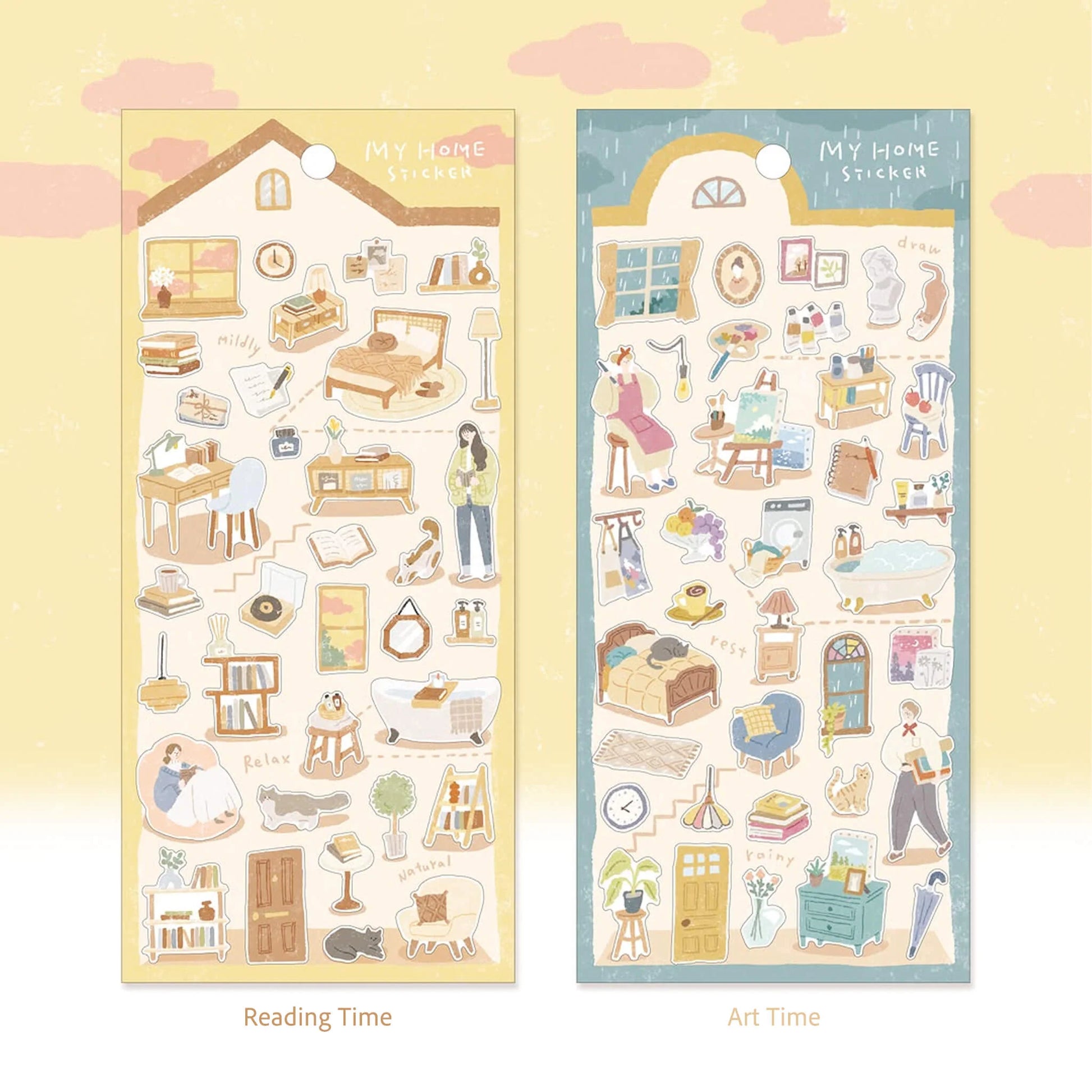 Mindwave’s My Home sticker series captures the gentle, heartwarming moments of everyday life. Whether it’s reading a book, making an art piece, dressing up, or simply unwinding at home.