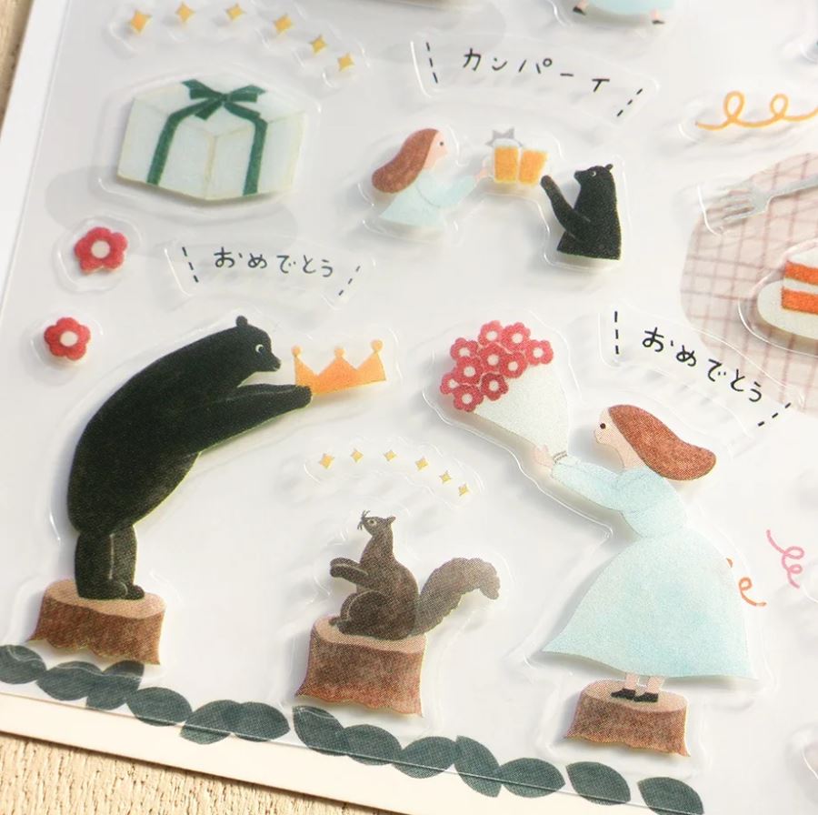 Celebrate birthdays in the most adorable way with the Necktie It's Your Birthday transparent sticker sheet! This delightful design features charming illustrations of a bear, a girl, and woodland creatures sharing heartwarming moments of a joyful birthday celebration. From gifts and balloons to cakes and candles, these stickers capture the magic of a special day.