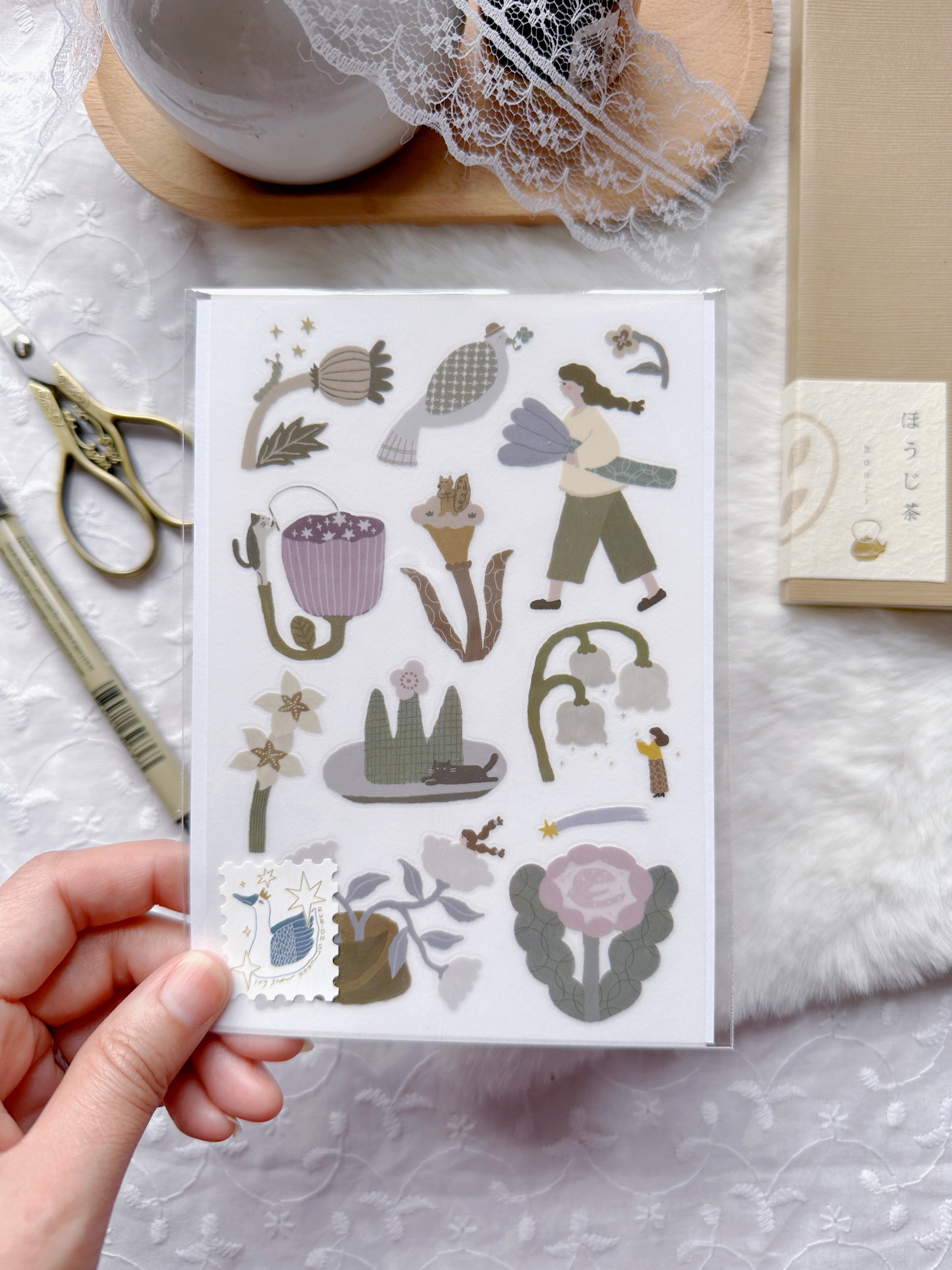 Capture the timeless beauty of the countryside with the Pastoral Poetry Transfer Sticker. Each sticker captures the beauty of rustic life, with charming scenes of flora being carefully tended to and admired. The illustrations tell stories of peaceful moments spent nurturing the plants and taking in the natural beauty, perfect for adding an enchanting, cozy touch to journals, planners, or crafts.