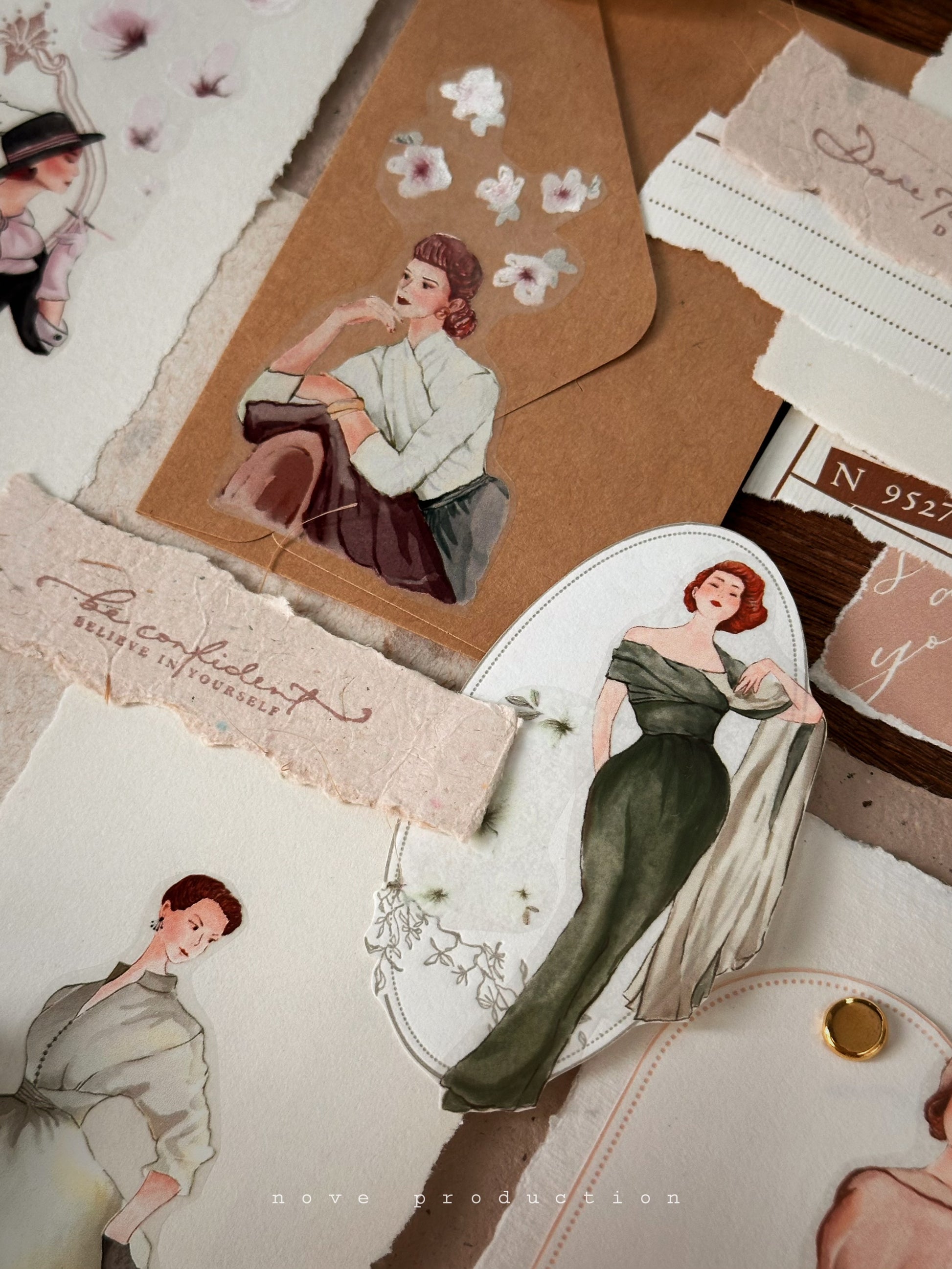 { Vintage Elegance } Matte PET tape is a must-have for vintage enthusiasts, featuring 12 beautifully hand-drawn illustrations of elegant ladies, paired with delicate florals and timeless wordings. These intricate designs add a charming, nostalgic touch to your journal pages, scrapbooks, or any creative project.